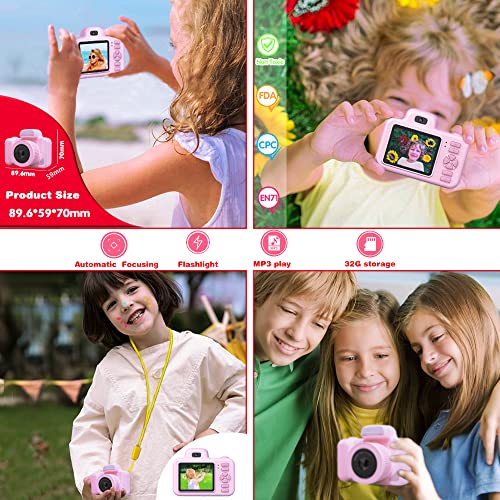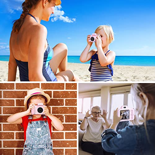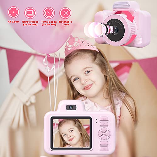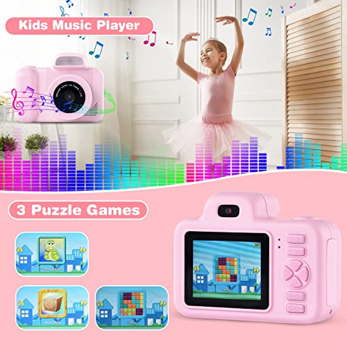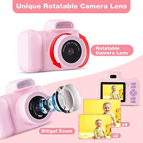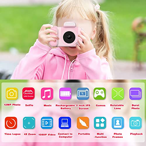 YunLone Kamera für Kinder 12 MP Selfie Kamera für Mädchen und Mädchen mit Musik-Player, drehbares Objektiv, SD-Karte 32 G, 2 Zoll HD 1080P Videokamera Geburtstag – Rosa